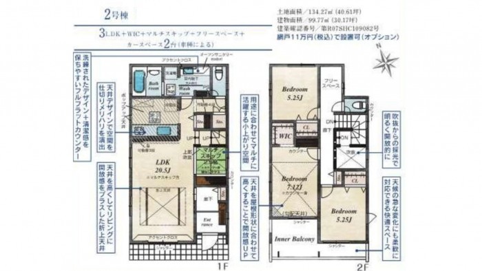 - カウンターキッチン、食器洗浄乾燥機、洗浄便座、浴室乾燥機、追い焚き、ウォークインクローゼット、モニタ付インターホン、駐車場2台分、床下収納、トイレ2箇所