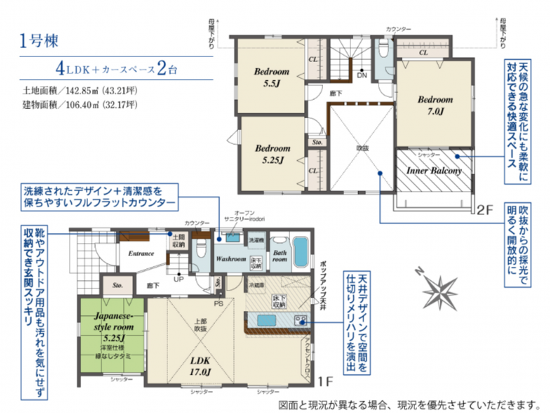 - システムキッチン、カウンターキッチン、食器洗浄乾燥機、シャンプードレッサー、洗浄便座、浴室乾燥機、追い焚き、モニタ付インターホン、駐車場2台分、床下収納、トイレ2箇所