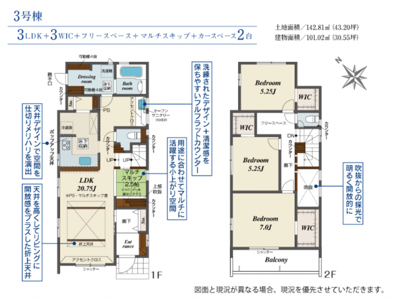 - システムキッチン、カウンターキッチン、食器洗浄乾燥機、シャンプードレッサー、洗浄便座、浴室乾燥機、追い焚き、複層ガラス、モニタ付インターホン、駐車場2台分、床下収納、トイレ2箇所