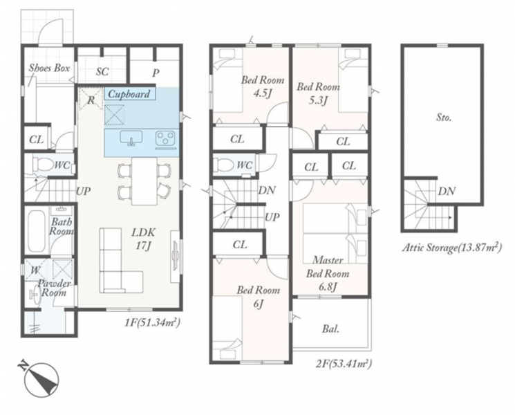 - 食器洗浄乾燥機、洗浄便座、浴室乾燥機、モニタ付インターホン、駐車場2台分、トイレ2箇所、パントリー、カップボード、リビングイン階段、宅配BOX付昨日門柱、電気施錠スマートコントロールキー
