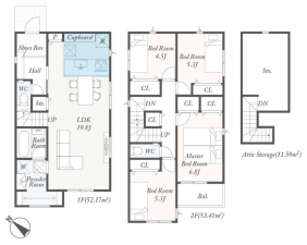 - 食器洗浄乾燥機、洗浄便座、浴室乾燥機、モニタ付インターホン、駐車場2台分、トイレ2箇所、パントリー、カップボード、リビングイン階段、宅配BOX付昨日門柱、電気施錠スマートコントロールキー
